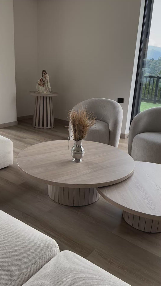 Cocina en madera ecológica en colores fresno europeo y taupe, con una isla que luce un impresionante mesón sinterizado Panda Grey