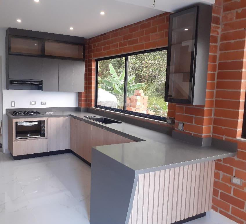 Como experto en la industria, te presentamos la cocina en madera ecológica en color rovere y graffo. Fabricada con materiales sostenibles, esta cocina te brinda una opción moderna y respetuosa con el medio ambiente. Además, su acabado en color rovere y graffo te aporta un toque elegante y atemporal en tu hogar. ¡Disfruta de una cocina de calidad ! Con rieles cierre lento full extensión pesados,puertas con perfileria en vidrio y mesón en quartzone gris (Valor aproximado, sujeto a medidas)