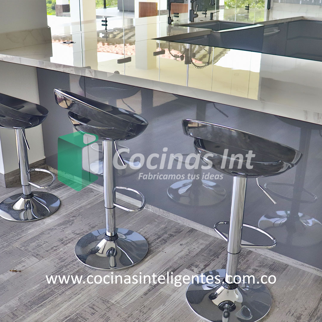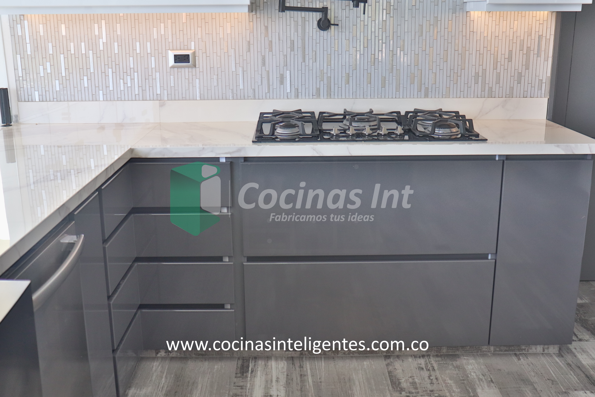 Cocina en madera ecológica, color plomo, mesón en sinterizado, rieles cierre lento, pozuelo en acero, electrodomésticos importados y acabados de lujo. (Valor aproximado, sujeto a medidas)
