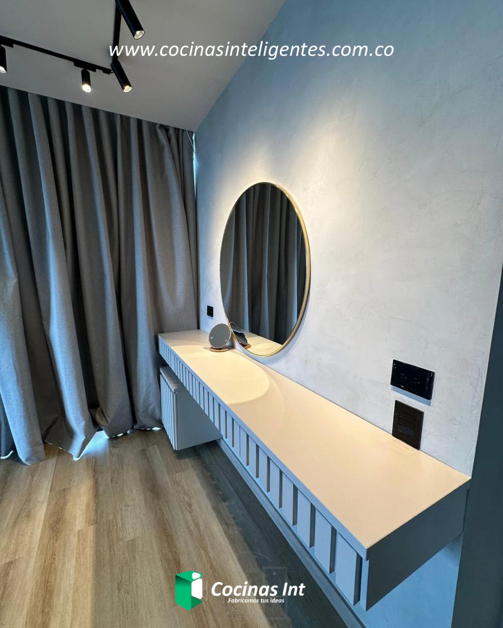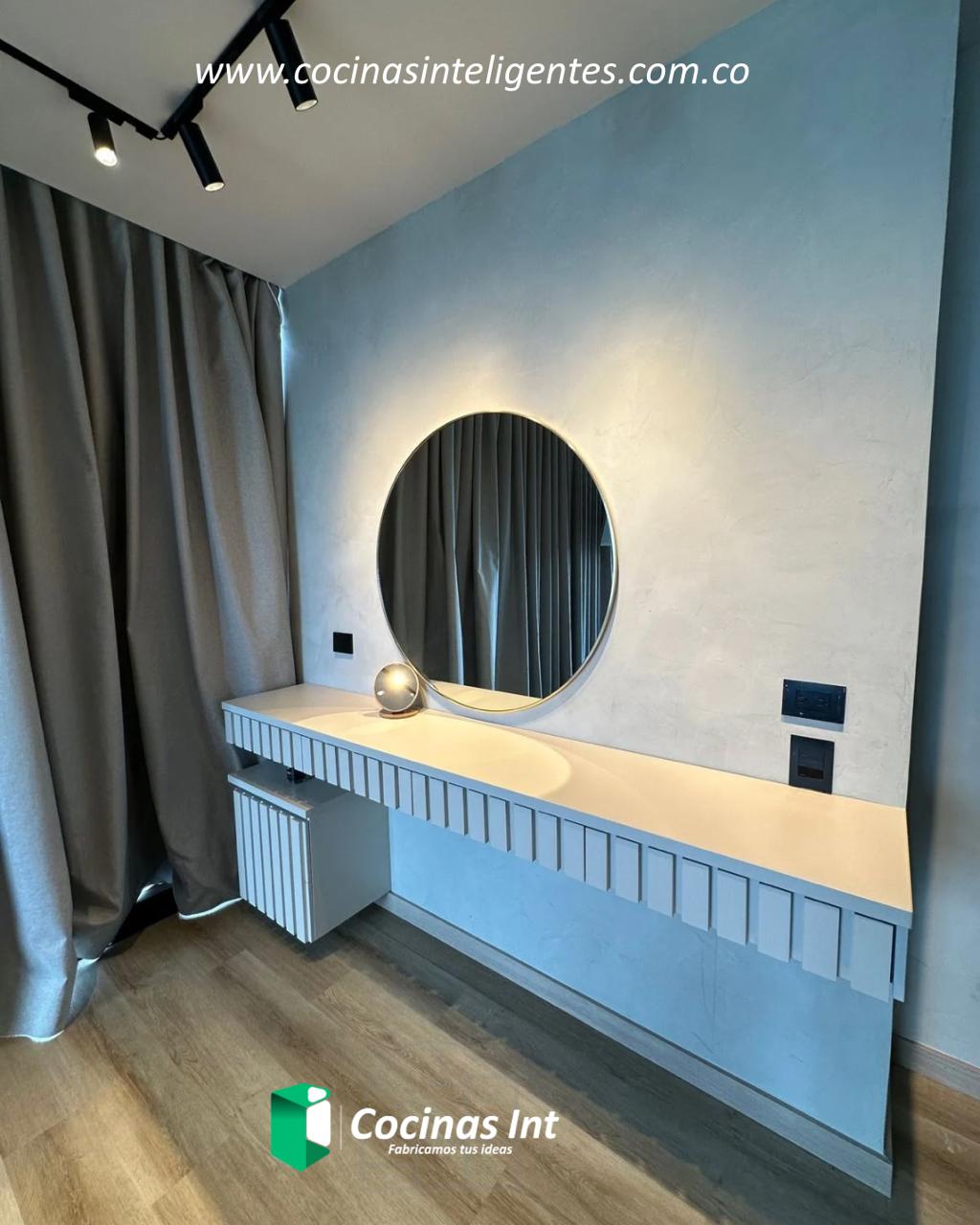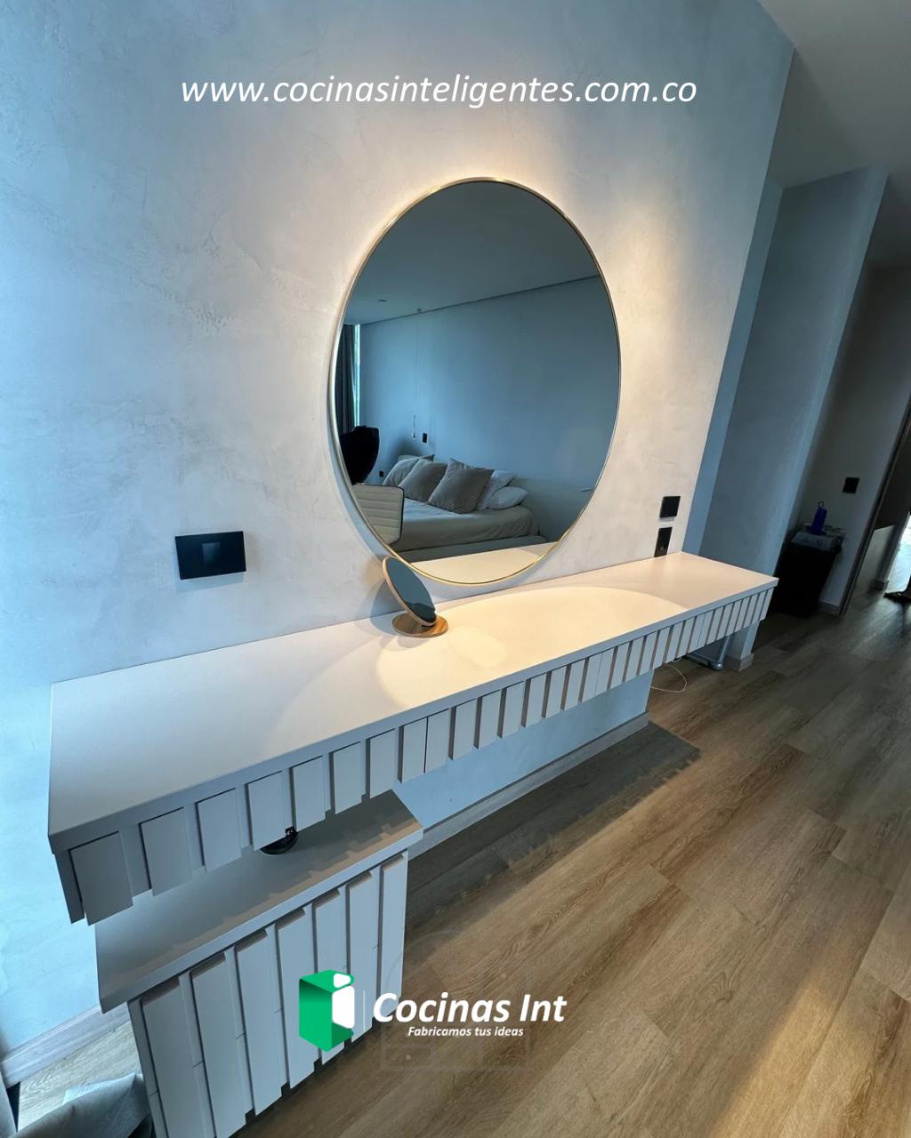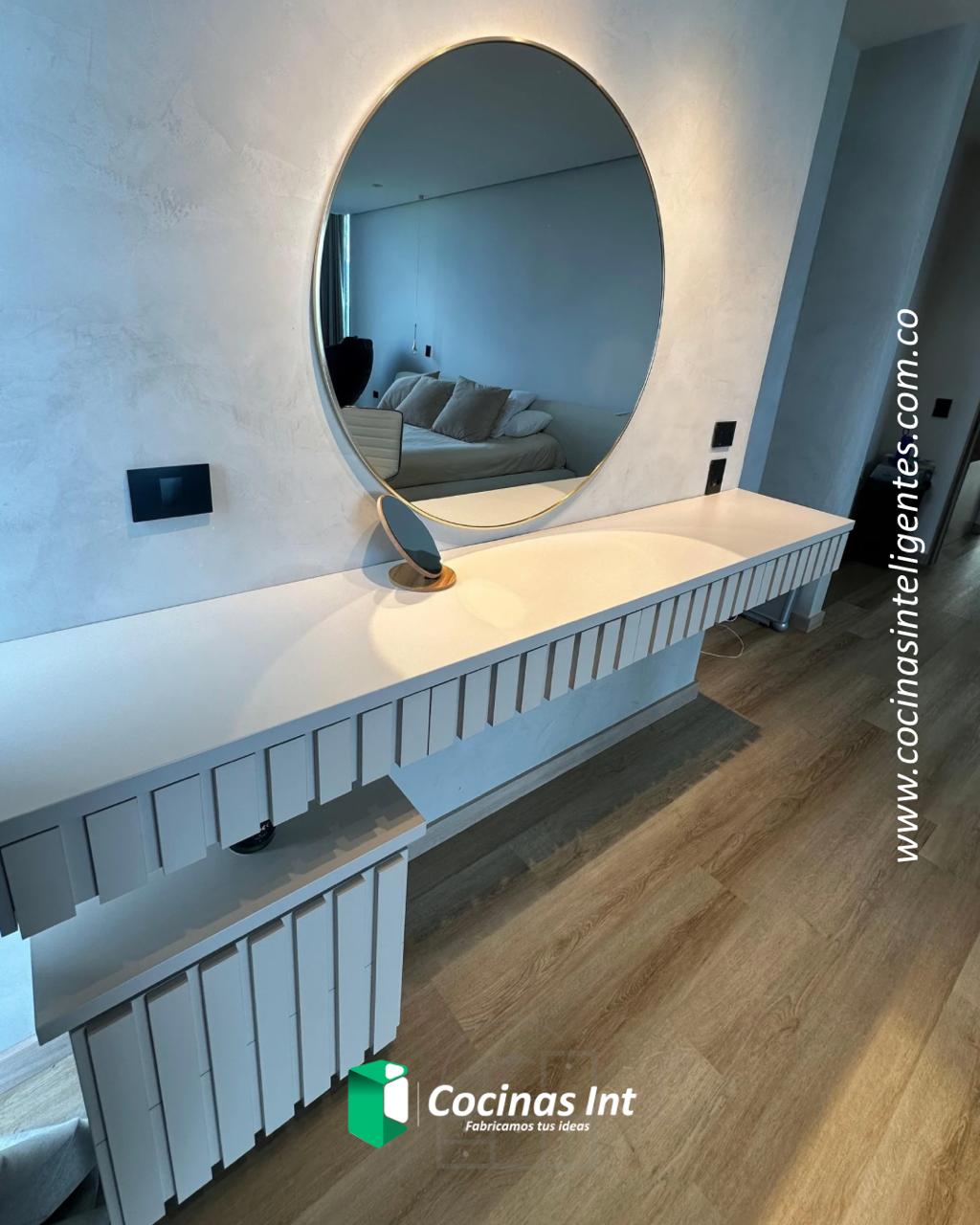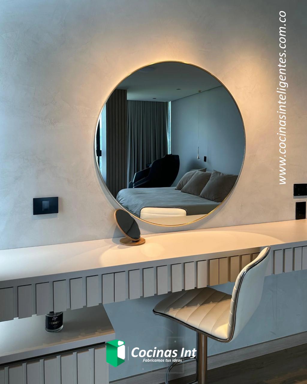 Transforma tus espacios con este elegante tocador diseñado para combinar funcionalidad y estilo. Su acabado minimalista y su espejo circular iluminado crean un ambiente sofisticado, perfecto para realzar cualquier habitación.